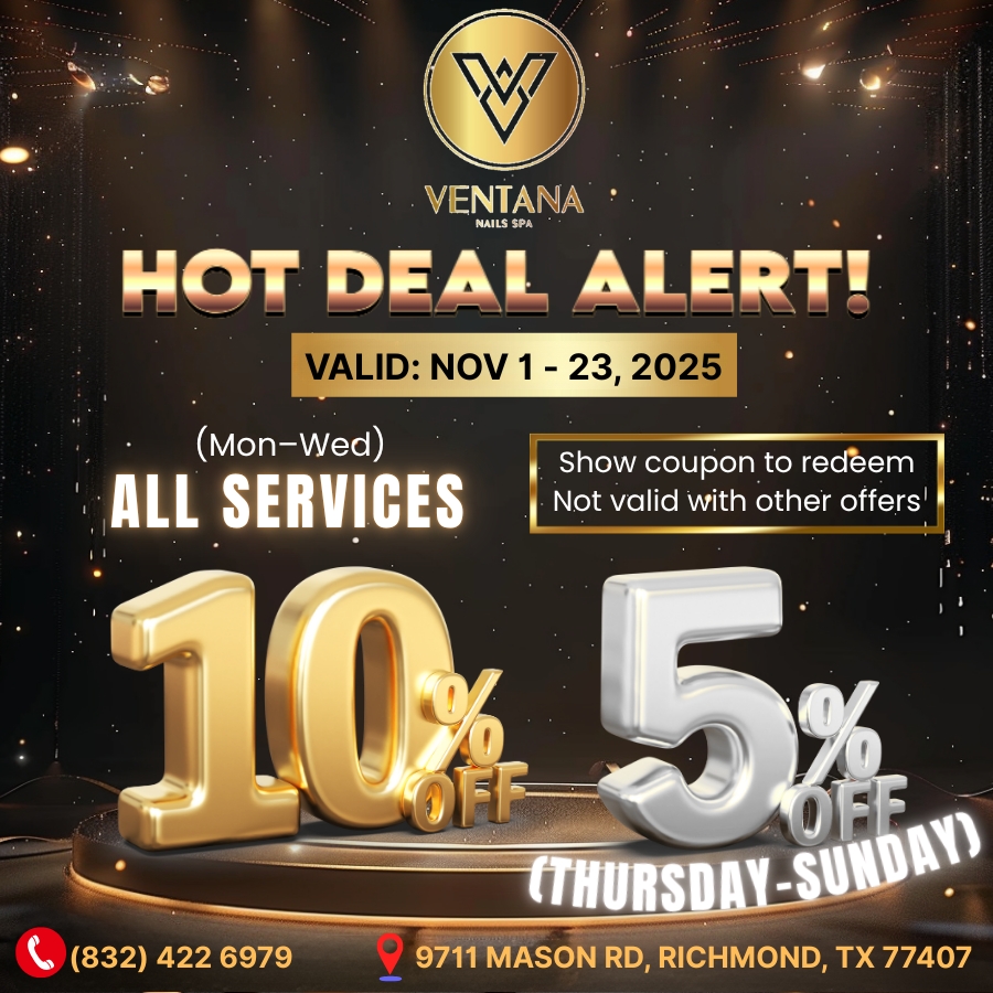 If you are seeking a nail salon that helps you to rejuvenate your beauty, VENTANA NAILS SPA is the ideal destination! Located conveniently in Richmond, TX 77407, our nail salon is proud to deliver the highest quality treatments to our customers.